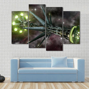 This striking canvas features a futuristic spaceship set against a backdrop of stars and a wispy nebula. With glowing green lights and spiky protrusions, it evokes a sense of mystery and adventure, perfect for any space enthusiast.