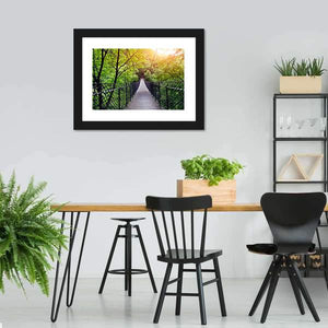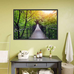 Immerse yourself in the serene beauty of this canvas wall art, featuring a suspension bridge nestled among vibrant trees and soft sunlight filtering through the leaves. Its tranquil ambiance makes it a perfect addition to any nature-inspired décor.