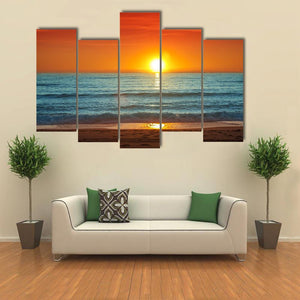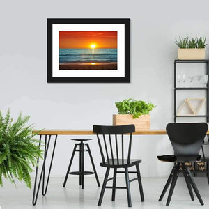 This canvas features a serene ocean sunset from Spain, beautifully capturing the warm orange and blue hues reflecting on the water. Its tranquil scene infuses any space with a peaceful atmosphere.