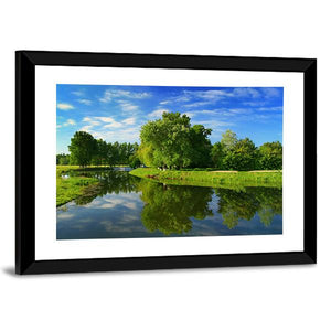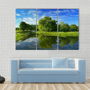 This landscape canvas art captures a serene scene of lush green fields and a tranquil lake, reflecting the fluffy clouds above. Its soothing palette of blue and green invites a peaceful ambiance, making it a beautiful addition to any room.