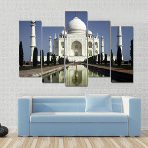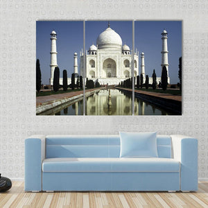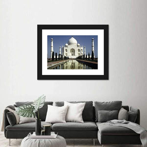 This canvas art showcases the Taj Mahal in a breathtaking morning scene, featuring its grand dome and minarets reflecting in a tranquil pool. With its peaceful ambiance and classic style, it makes a striking addition to any wall.