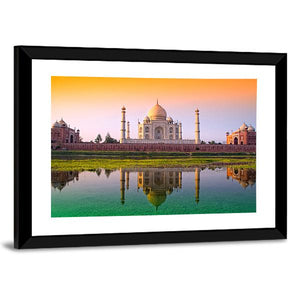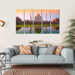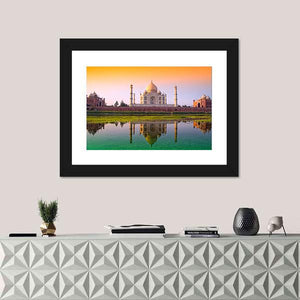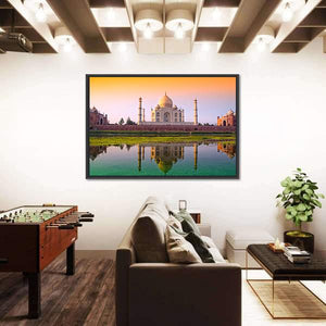 This striking canvas art captures the iconic Taj Mahal reflecting over a serene river, framed by a peaceful sky. The warm hues of orange, green, and blue create a majestic atmosphere that enhances any room with a touch of tranquility.