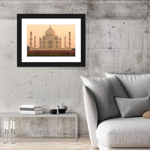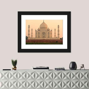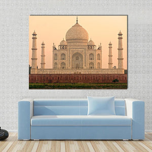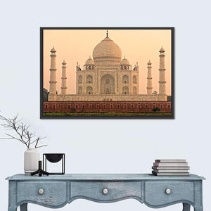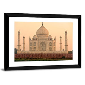 This canvas wall art captures the majestic Taj Mahal at sunrise, showcasing its beautiful symmetry in a serene palette of white, cream, orange, and green. It's a stunning depiction of one of India's most iconic architectural masterpieces.