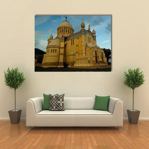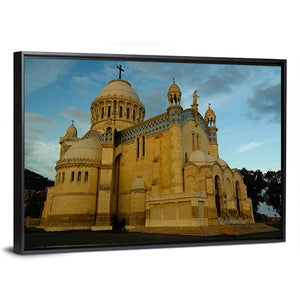 Cathedrale Notre Dame d'Afrique is shown from a low, wide angle, with the dome, cross and arches centered against a blue sky with soft clouds. The photorealistic image uses blue, golden and white tones to create a grand, serene, and spiritual atmosphere. It suits living rooms, entryways, or studies that appreciate architectural and religious subjects.