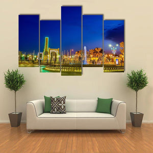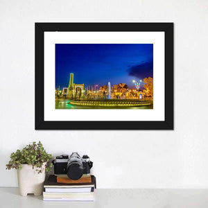 Fountain In Touggourt shows a centered, symmetric nighttime cityscape featuring a glowing fountain, surrounding architecture and palm trees with lights reflecting on the water. Rendered in a realistic style, the print uses blue, yellow, green and white to create a festive, vibrant atmosphere. It suits modern homes and room decor that welcome lively, colorful wall art.