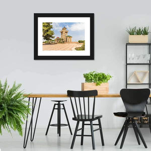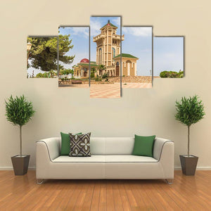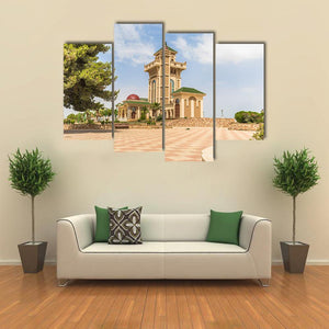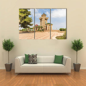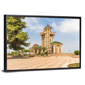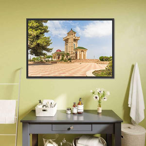 This photorealistic canvas captures Plateau of Lalla Setti in Tlemcen, showing a building with a red domed roof, a tall tower trimmed in green, trees and a checkered paved courtyard under a clear blue sky. The bright, sunny, serene scene feels inviting and works well with modern canvas art and room decor.