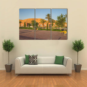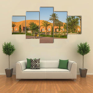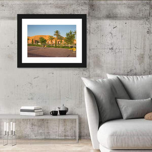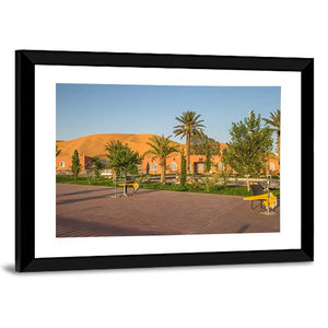 A realistic landscape print of the town of Taghit in Algeria, capturing a tranquil, warm desert resort scene with palm trees, dunes and a building with archways. The wide-angle, eye-level composition and a palette of sandy brown, sky blue, orange and green create an inviting mood that suits modern living rooms or travel-inspired room decor.
