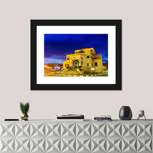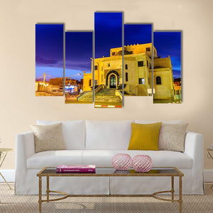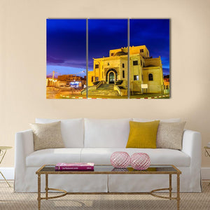 A photographic canvas showing typical buildings in Algeria: a center-focused, elevated view of a mosque and nearby houses with domed roofs, arched doorways, steps and illuminated windows beneath a dusk sky. Cool blues and warm yellows with touches of white and red give a serene yet dramatic, historic mood that suits modern or traditional room decor.
