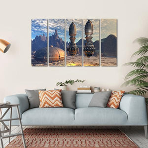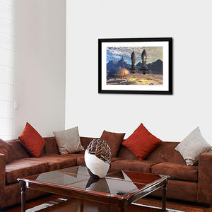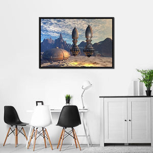This striking canvas print depicts a surreal alien landscape featuring a sleek flying saucer hovering over a jagged mountain range. The futuristic scene is enhanced by dramatic clouds and a vivid palette of blue, tan, and orange, inviting a sense of exploration and wonder.