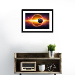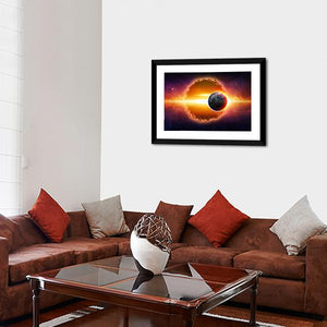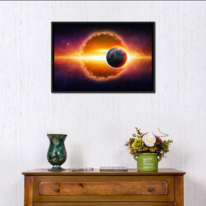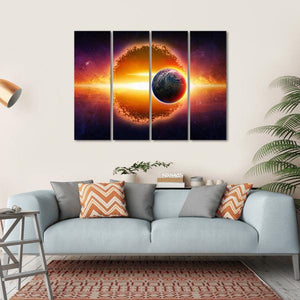 This captivating canvas art features a planet with visible continents amidst a dramatic cosmic event. The vibrant palette of orange, purple, blue, and red conveys an awe-inspiring atmosphere that invites contemplation of the universe's mysteries.
