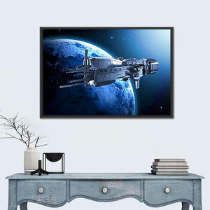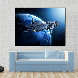This canvas art portrays a detailed spaceship soaring above a blue planet cloaked in clouds. With its sci-fi and futuristic vibe, it creates an epic scene that captivates the imagination.