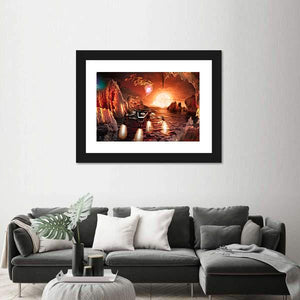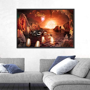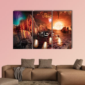A glowing spaceship descends onto a jagged alien landscape beneath a large, bright sun, with aurora-like streaks painting a red, orange and purple sky. The digital art uses depth and a rule-of-thirds composition to create a mysterious, dramatic, otherworldly mood that suits modern home decor.