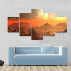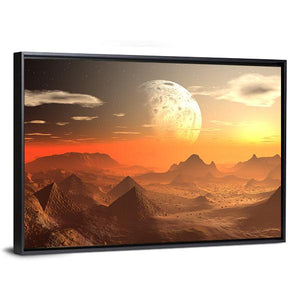 This canvas art features an alien planet landscape, complete with pyramid-like structures and a cratered moon. The warm, orange and brown hues convey a mysterious and awe-inspiring atmosphere, making it a striking piece for any modern decor.