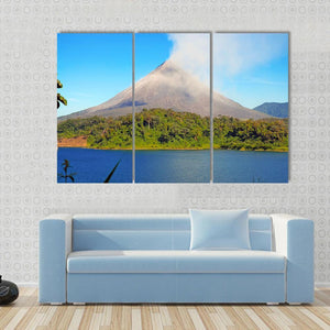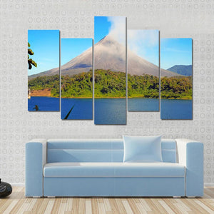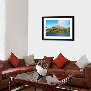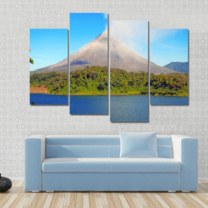 This landscape artwork features a majestic view of Arenal Volcano surrounded by a serene lake and lush forest. The peaceful palette of blue, green, and gray creates a calming atmosphere, making it a perfect addition to your home decor.