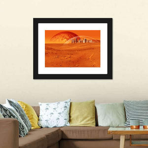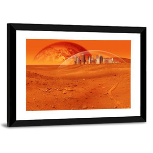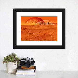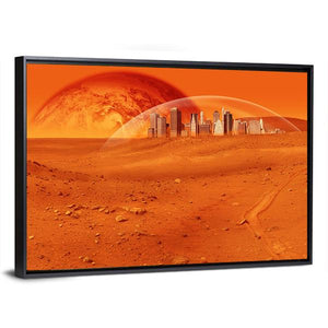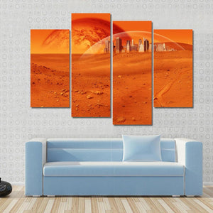 This landscape canvas art depicts an awe-inspiring alien planet. With its vibrant palette of orange and red, it evokes a futuristic atmosphere, showcasing a domed city against a desolate backdrop.