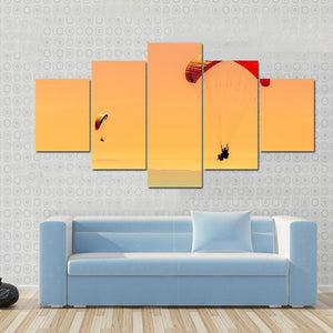 This canvas art features two paragliders soaring over rolling green hills. The serene yet adventurous scene captures the vastness of the landscape, blending vibrant hues of orange, blue, and yellow.