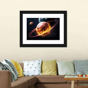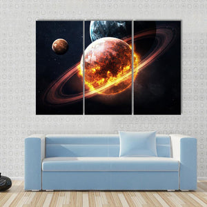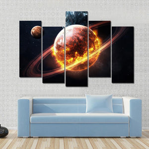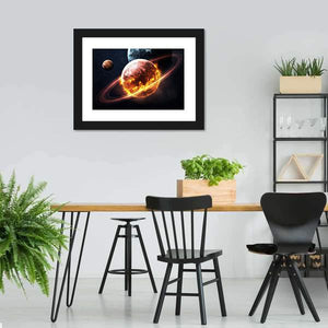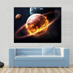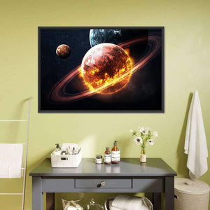 This striking canvas art features a glowing planet with rings set against a vast cosmic backdrop. The rich palette of orange, red, and blue captures the epic essence of outer space. Ideal for modern decor, it adds a sci-fi touch to any room.