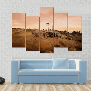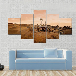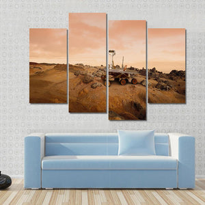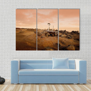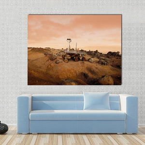 This canvas art features a Mars rover exploring the desolate Martian landscape under a cloudy orange sky. Its exploratory mood adds a touch of adventure and intrigue to any space.