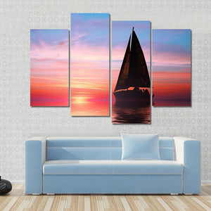 This canvas art depicts a serene sailing scene at sunset, capturing the majesty of a silhouetted sailboat against a vibrant sky. The calming colors of orange, pink, blue, and purple reflect beautifully on the water, making it a peaceful addition to any wall.