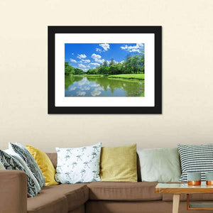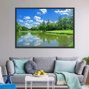 A realistic lakeside scene of lake, trees, sky and clouds with the clouds reflected in the water. The composition follows the rule of thirds and the blue, green and white palette creates a peaceful, serene mood. Suited to modern home living spaces as a calm focal piece.