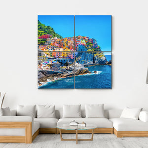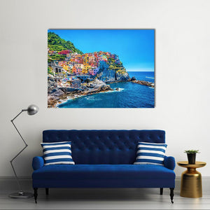 This canvas art captures the vibrant beauty of Cinque Terre, showcasing colorful buildings perched on cliffs by the serene ocean. With a palette of blues, yellows, and greens, it brings a picturesque coastal village scene into your space.