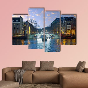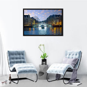A photographic canvas of Amsterdam’s canal, showing an illuminated bridge, buildings and a small boat reflected on calm water. Soft blues, warm yellows and pale pinks give the scene a peaceful, enchanting twilight mood. The image pairs well with modern and contemporary room decor and travel-inspired walls.