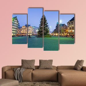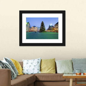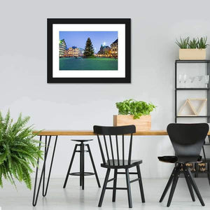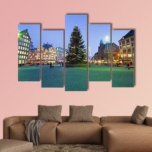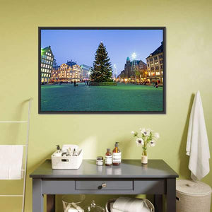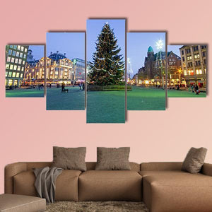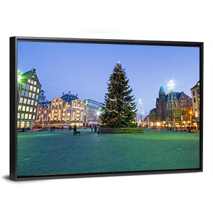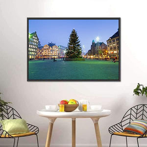 Christmas In Amsterdam shows a photorealistic cityscape of Amsterdam with an illuminated Christmas tree in a public square and buildings lined with festive lights. The wide-angle composition and deep perspective convey a twilight, urban mood with cool blues and greens warmed by yellow highlights. Suited to modern, urban room decor such as living rooms or entryways.