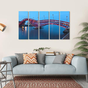 This canvas art features the striking Python Bridge in Amsterdam, beautifully illuminated under the night sky. With its rich colors and serene reflections on dark blue water, it adds a modern touch to any space.