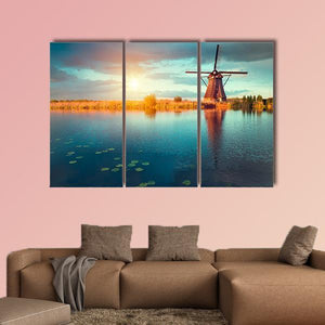 Traditional Dutch windmills rest beside calm water at sunset, with water lilies and the windmill reflected on the surface. The realistic landscape uses blue, orange, brown, and green tones and a rule-of-thirds composition to create a peaceful, tranquil mood. A quiet choice for home room decor and modern interiors.
