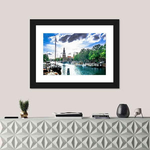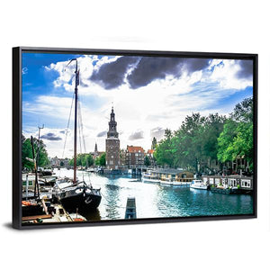 A realistic daytime view of an Amsterdam canal featuring traditional buildings, sailboats docked and a tall clock tower. The composition uses depth and rule-of-thirds to draw the eye; a blue-green palette gives a peaceful, sunny, and vibrant travel-inspired mood that suits modern or travel-themed room decor.