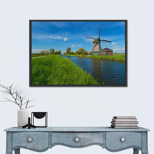 This canvas art captures a serene windmill scene on the outskirts of Amsterdam, featuring a tranquil canal, grassy fields, and a bright blue sky scattered with fluffy white clouds. It brings the idyllic charm of rural Netherlands into any space.