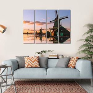 This canvas art captures the serene beauty of traditional Dutch windmills alongside a tranquil canal. The picturesque scene, with reflections on the water, evokes a peaceful atmosphere, making it an ideal addition to your landscape decor.