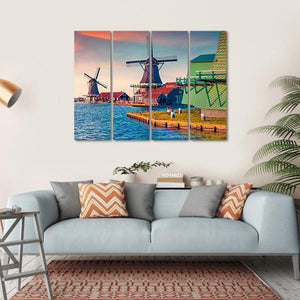 This canvas print captures the beauty of traditional Dutch windmills alongside serene water channels. With a palette of blues, reds, and greens, it evokes a peaceful and historic atmosphere, perfect for adding a scenic touch to any room.