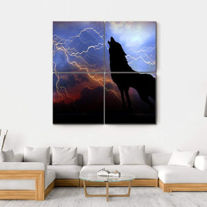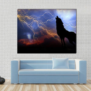 This striking canvas features a silhouette of a wolf howling amid a dramatic lightning storm. The powerful composition, with its bold palette of blue, yellow, and orange, evokes a sense of wild energy and evokes the beauty of nature's fury.
