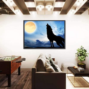 This canvas art features a wolf silhouette howling against a full moon, set in a dramatic night sky. The mysterious and serene tones of blue, black, and yellow create a captivating atmosphere, making it a striking piece for nature lovers.