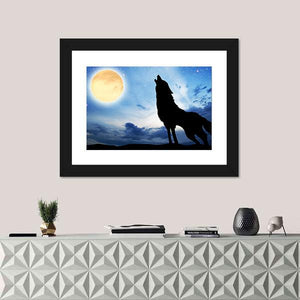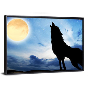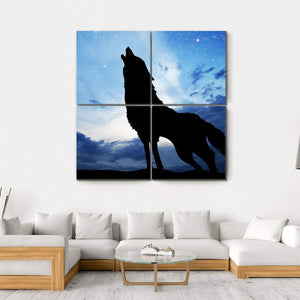 This captivating canvas artwork features a striking wolf howling at a full moon, set against a starry sky and dark clouds. The silhouette design evokes a mysterious and wild atmosphere, making it an eye-catching addition to any contemporary space.