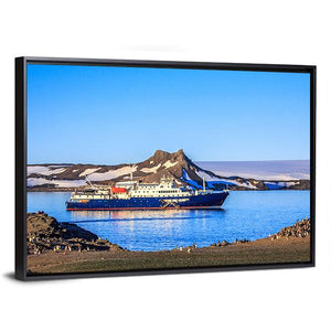 A panoramic scene of a large cruise ship docked in calm blue water with snow-capped mountains, icebergs, and a colony of penguins on the shore. Rendered realistically in blues, whites, browns, and blacks, the image feels peaceful and serene with an adventurous undertone. Suited to coastal, nature-themed, or modern living spaces.