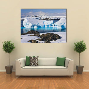 This canvas print captures the serene beauty of icebergs in Antarctica, showcasing a majestic snowy landscape. The cool palette of blues, whites, and greys enhances the tranquil atmosphere, making it a striking addition to any room.