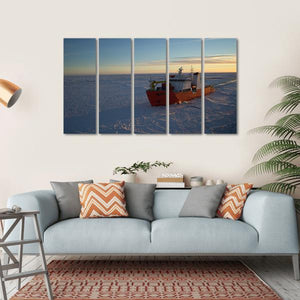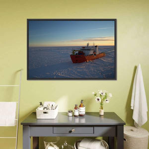 This captivating canvas features an orange icebreaker navigating through icy waters beneath a vast sunset sky. Its serene and epic atmosphere invites a sense of cold tranquility, making it a striking addition to any space.