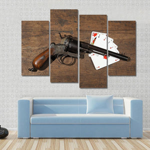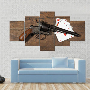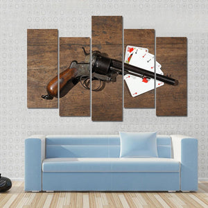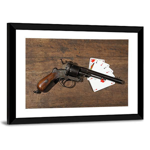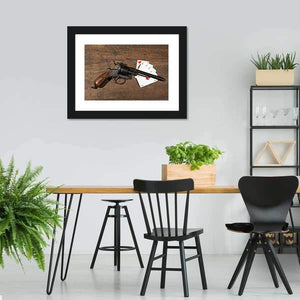 This canvas features a dramatic scene depicting a revolver alongside playing cards on a wooden table. The vintage style is enhanced by a rich palette of brown, red, and black, making it an intriguing focal point for any space.