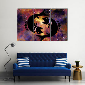 Sign Of Pisces Canvas Wall Art centers on the Pisces zodiac: a symmetrical silhouette of two fish tied together set against a starry, cosmic background. Rendered in black, gold, purple, and orange with a modern abstract style, it creates a mystical, serene mood that suits modern or astrology-themed rooms.