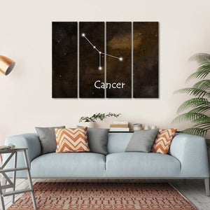 This captivating artwork features the Cancer constellation, beautifully illustrated against a rich black and white backdrop. With connecting lines between the stars and the word 'Cancer' printed below, it evokes a mysterious and cosmic atmosphere for your space.