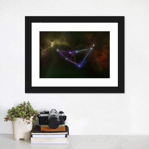 Capricorn Constellation Canvas Wall Art depicts the Capricorn constellation with glowing stars centered on a deep space backdrop of dark blue, purple, gold, and black. The abstract, modern celestial style gives the piece a mysterious, cosmic, dreamy mood and suits modern or celestial-themed rooms.