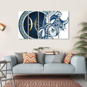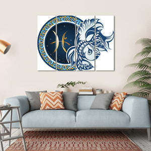 This artwork features the Pisces zodiac symbol, beautifully illustrated with a stylized two fish design against a starry background. The rich palette of blue, gold, and white adds a mythical and celestial quality to your space.