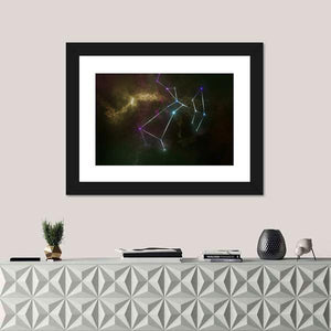 This canvas depicts the Sagittarius constellation with glowing lines connecting the stars against a swirling nebula, creating a mysterious, cosmic mood. A black field with green, purple, blue and yellow accents gives the piece depth and an abstract, modern feel. It suits modern and celestial-themed decor.
