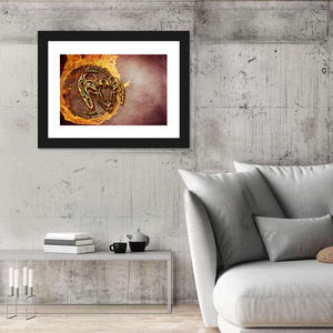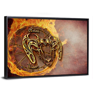Aries symbol and zodiac details set a fiery, powerful, mystical tone in this canvas wall art. Flames and a constellation dial sweep across a rule-of-thirds, modern-abstract composition in gold, orange and brown, suited to warm-toned or astrology-focused rooms.