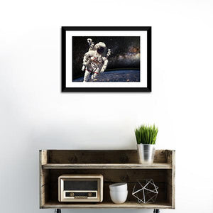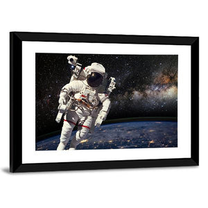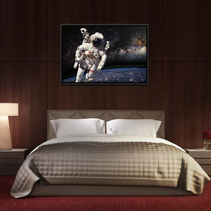 This canvas art features a striking astronaut in the foreground, gazing at a swirling galaxy and glowing city lights on Earth. It evokes a sense of wonder and exploration, perfect for any modern space.
