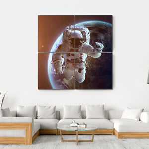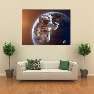 This stunning canvas artwork features an astronaut in a white spacesuit floating near Earth, with the moon visible in the background. The vibrant palette of blue, white, and orange creates an awe-inspiring and adventurous atmosphere perfect for any space enthusiast.