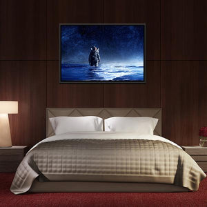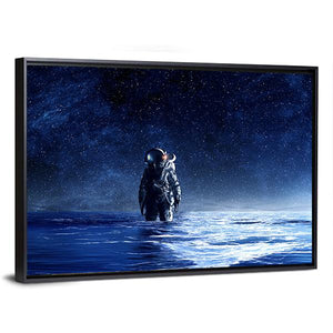 An astronaut wading through water beneath a starry night sky, painted in cool blues, black, white, and grey. The centered, modern sci‑fi composition feels surreal, quiet, and expansive and pairs well with modern home and room decor.