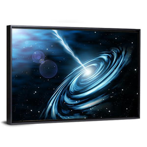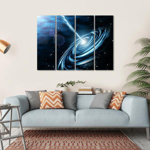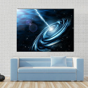 Dive into the cosmic realm with the Blue Galaxy With Star Dust canvas art. Featuring a black hole and a swirling galaxy, this piece captures the energetic and dramatic essence of outer space. It's an ideal addition to modern abstract décor, elevating any room's atmosphere.